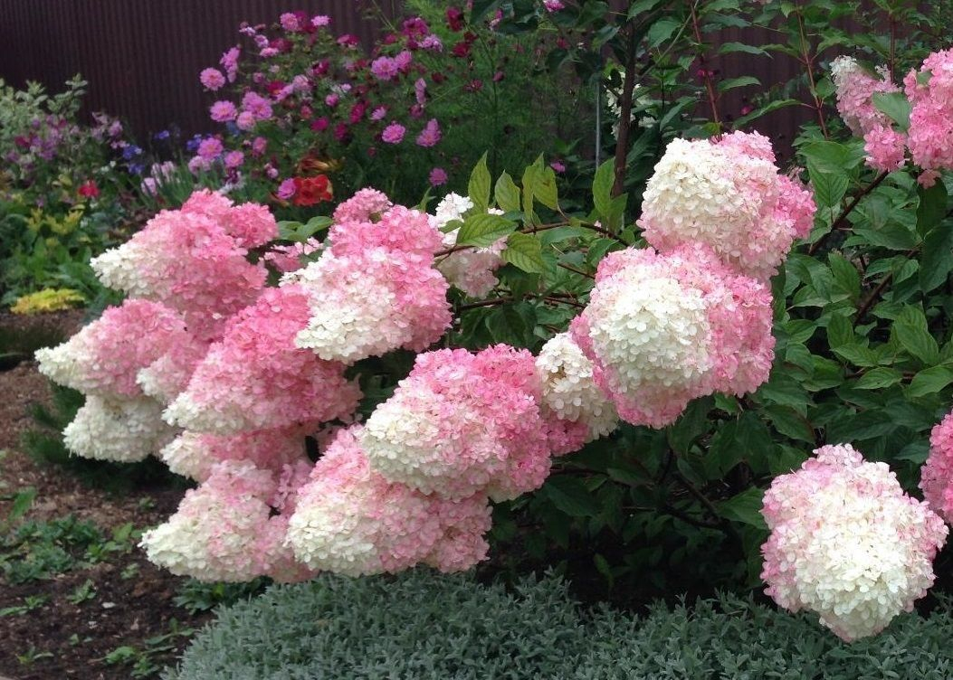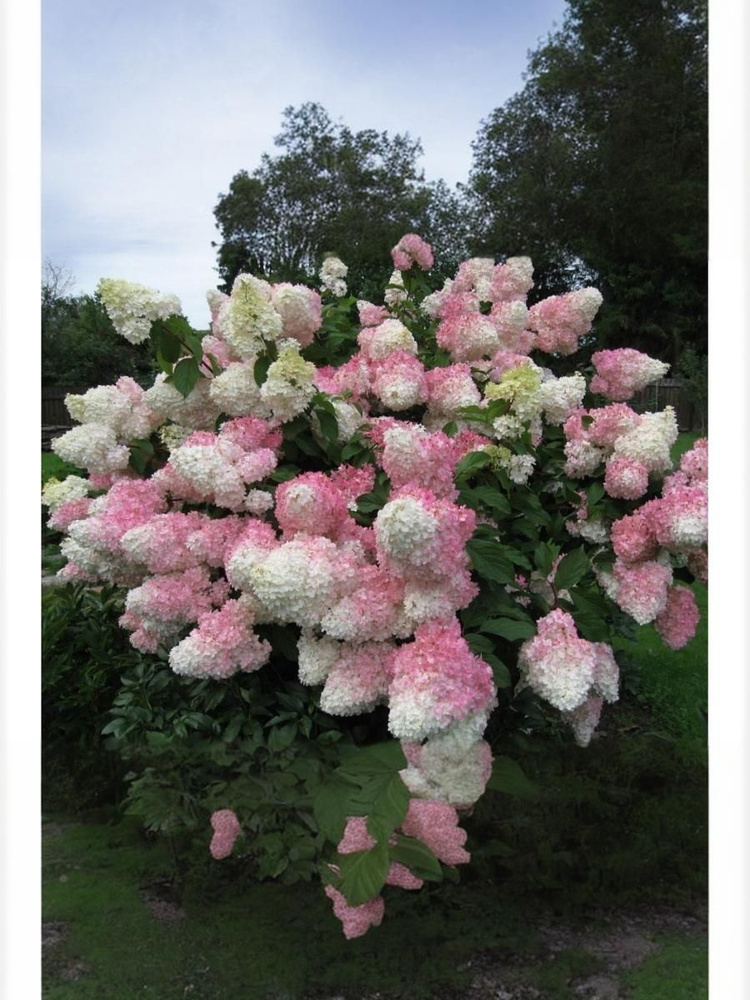 Соцветия 25-30 см, имеют ванильно-клубничный оттенок, сначала они сливочно-белые, затем нежно-розовые, затем становятся малиновыми, при этом верхушки остаются белоснежными.