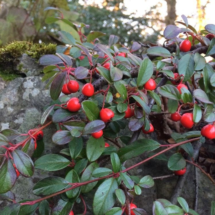 Почвопокровный вечнозеленый кустарник. Мелкие темно-зеленые листья осенью меняют цвет на пурпурный. Цветет мелкими цветами бледно-красного цвета. Ягоды коралловых оттенков, они украшают куст до осени.