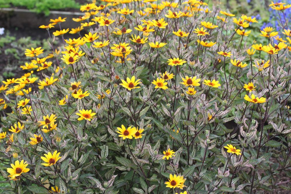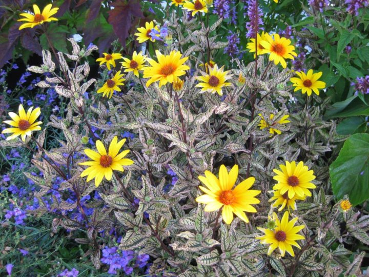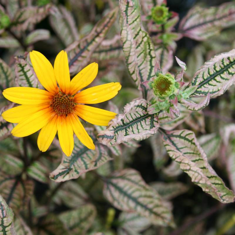 Имеет удивительный окрас листьев: зеленые прожилки по центру на фиолетово-пурпурных листьях, края которых слегка загнуты внутрь. На таком фоне ярко-желтые цветки с оранжевыми серединками смотрятся особенно эффектно.
