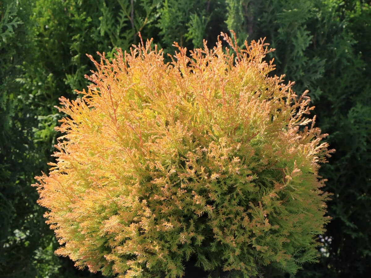 Хвоя чешуевидная и игловидная ярко-жёлтой окраски с оранжевыми молодыми приростами, бронзово-жёлтая зимой.