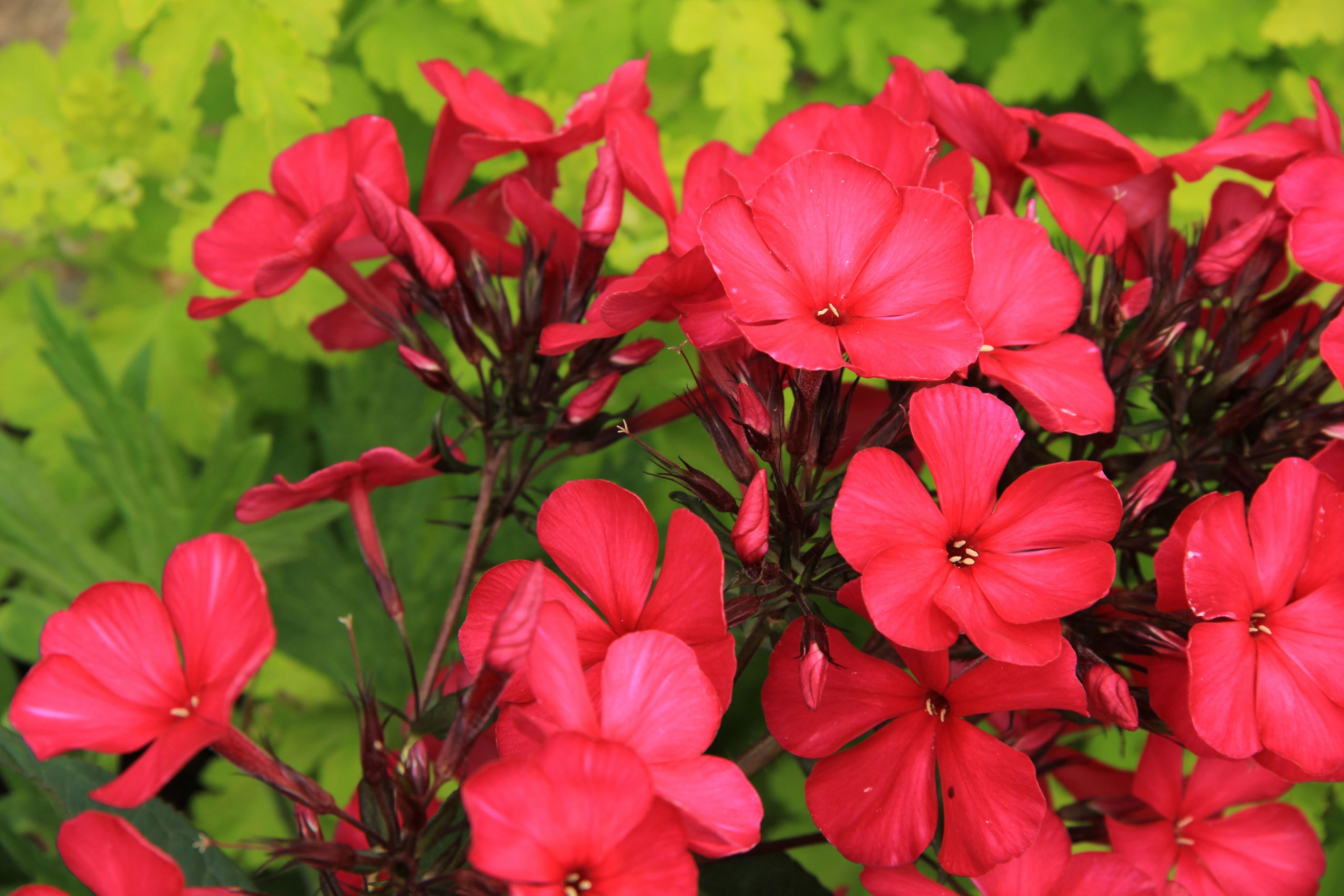 Соцветие округло-коническое, среднего размера, плотное, цветки вишнево-красные, очень яркие, не выгорают на солнце. Самый яркий из всех красных.