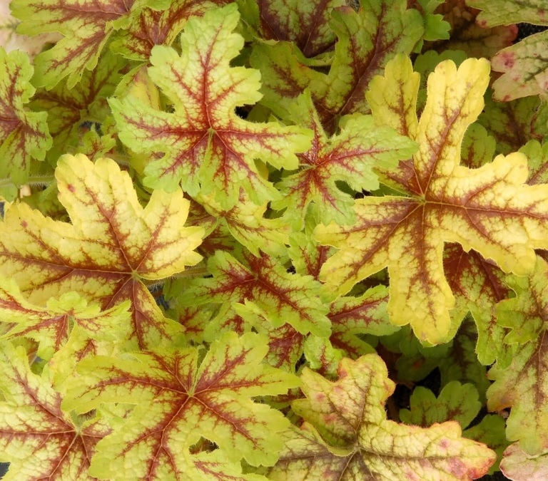 Листья рассеченные, золотисто-салатового оттенка с красными прожилками.
