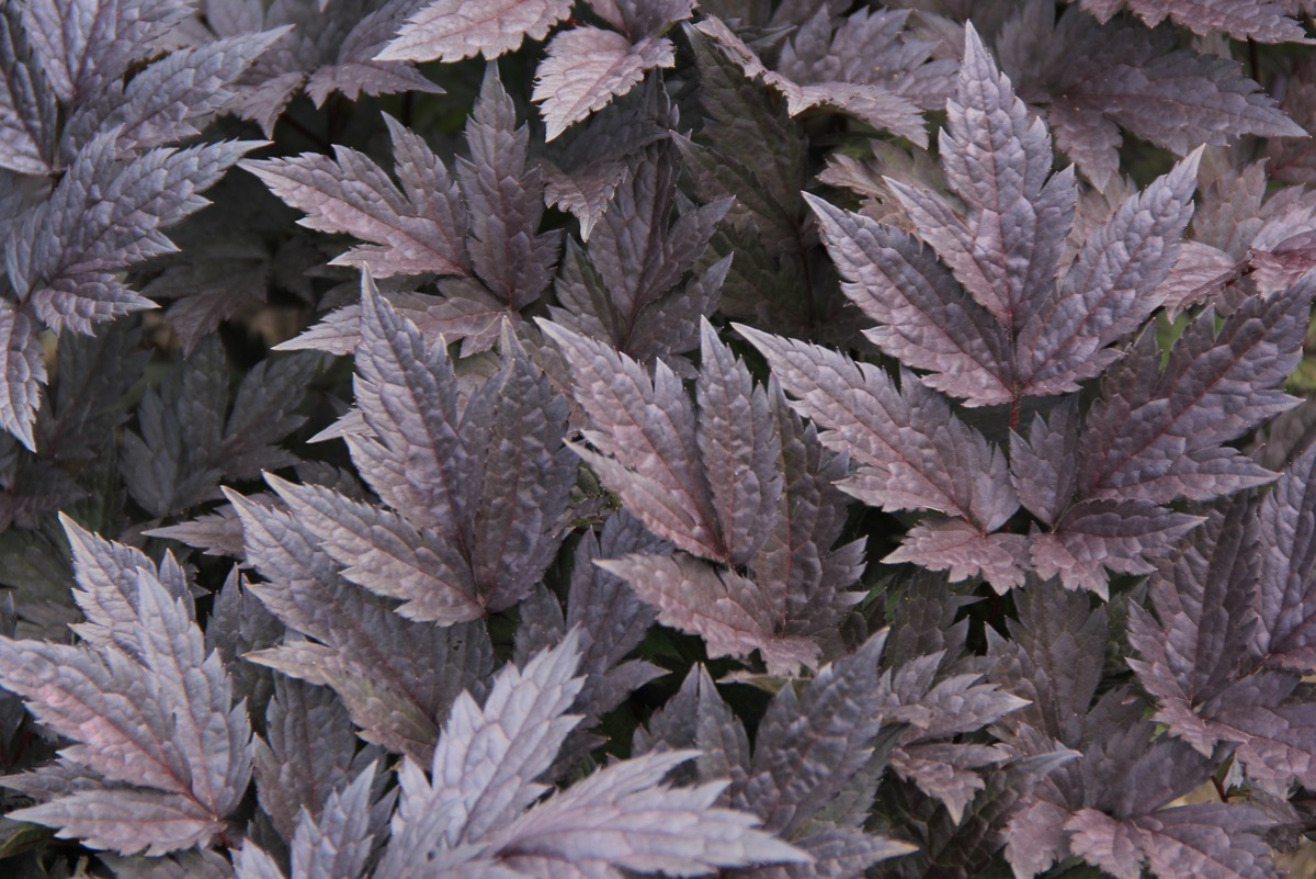 Листья крупные, сложные, ажурные, насыщенно-пурпурные, почти чёрные весной и бронзово-шоколадные летом. Побеги прямые, прочные, не требуют подвязки.