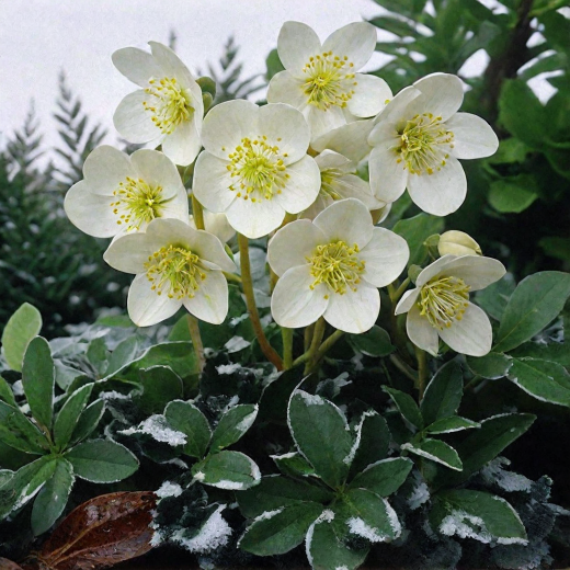 Весной новая плотно-кожистая, тройчатая, пильчатая листва постепенно заменяет прошлогодние листья, зимовавшие под снегом. В апреле появляются крупные, открытые цветки-блюдца. Их лепестки имеют овальную форму и волнистую поверхность, розовеющую снаружи. В центре бутона находится крупный помпон желтых тычинок.