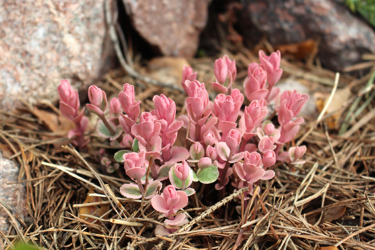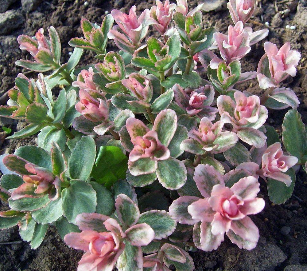 Листья серо-зелёные, молодые листья с розовой каймой и кремовыми мазками. Цветение обильное. Соцветия состоят из красивых розовых цветков.