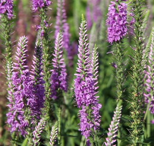 Окраска цветков варьируется от светлой сиренево-фиолетовой до насыщенного фиолетового цвета, в плотных колосовидных соцветиях. Листья тёмно-зелёные.