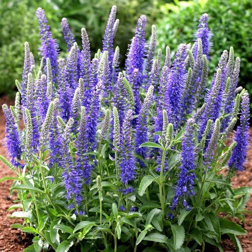Мелкие цветы насыщенно-синего цвета, собраны в узкие длинные колосовидные соцветия. Листья узко-овальные, зубчатые.