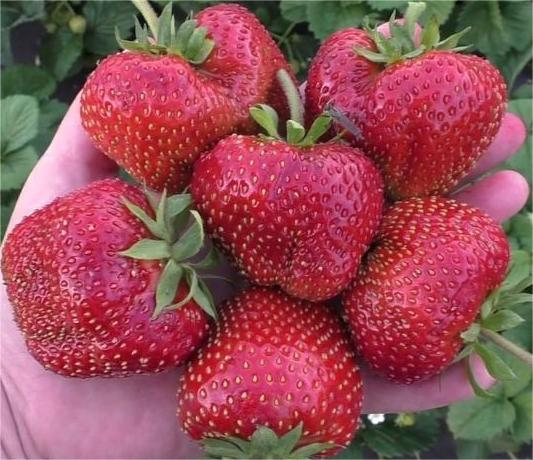 Ягоды 60-80 г, красно-малиновые, ширококонической формы. Мякоть плотная, красного цвета, сладкая с небольшой кислинкой, ароматная.