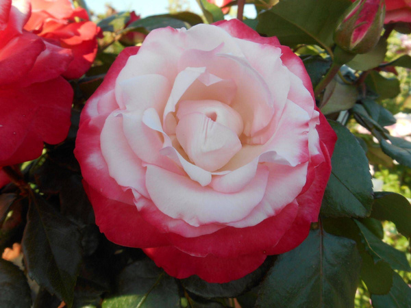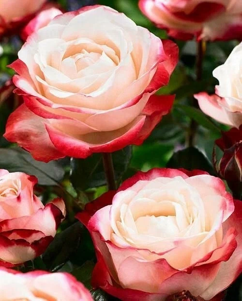 Цветки крупные, чашевидные, с закрученными белыми лепестками в центре и ярко-вишнево-красными по краям. Цветки раскрываются медленно, долго стоят в срезке и хорошо держат цвет. Лепестки имеют слегка волнистый край, так, что цветок сохраняет привлекательность на всех стадиях роспуска. Аромат сильный сладкий.