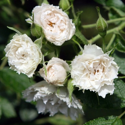 Цветки махровые, белые, собраны в небольшие соцветия. Лепестки цветка имеют зубчатый край, поэтому культивар иногда называют «гвоздичной розой». Цветение с июня по август. Аромат слабый.