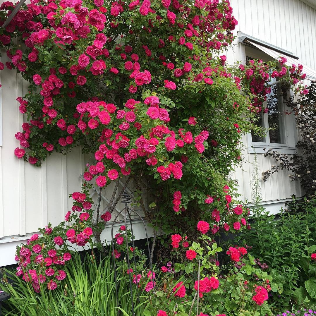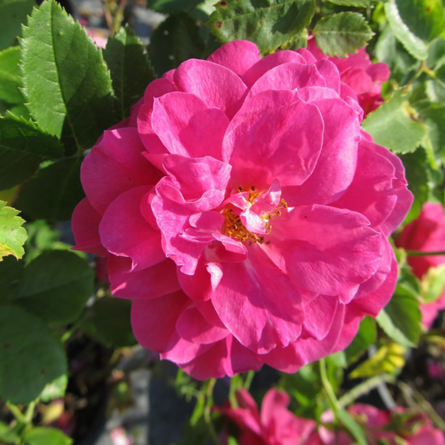 Симметричный, крепкий куст, длительный период цветения и превосходная устойчивость к заболеваниям делают эту розу одной из самых важных современных роз для северных садов. Цветки махровые, широко чашевидные, 5-6 см в диаметре, густо-розового или пурпурно-розового цвета, подсвечиваются ярко-желтыми тычинками.