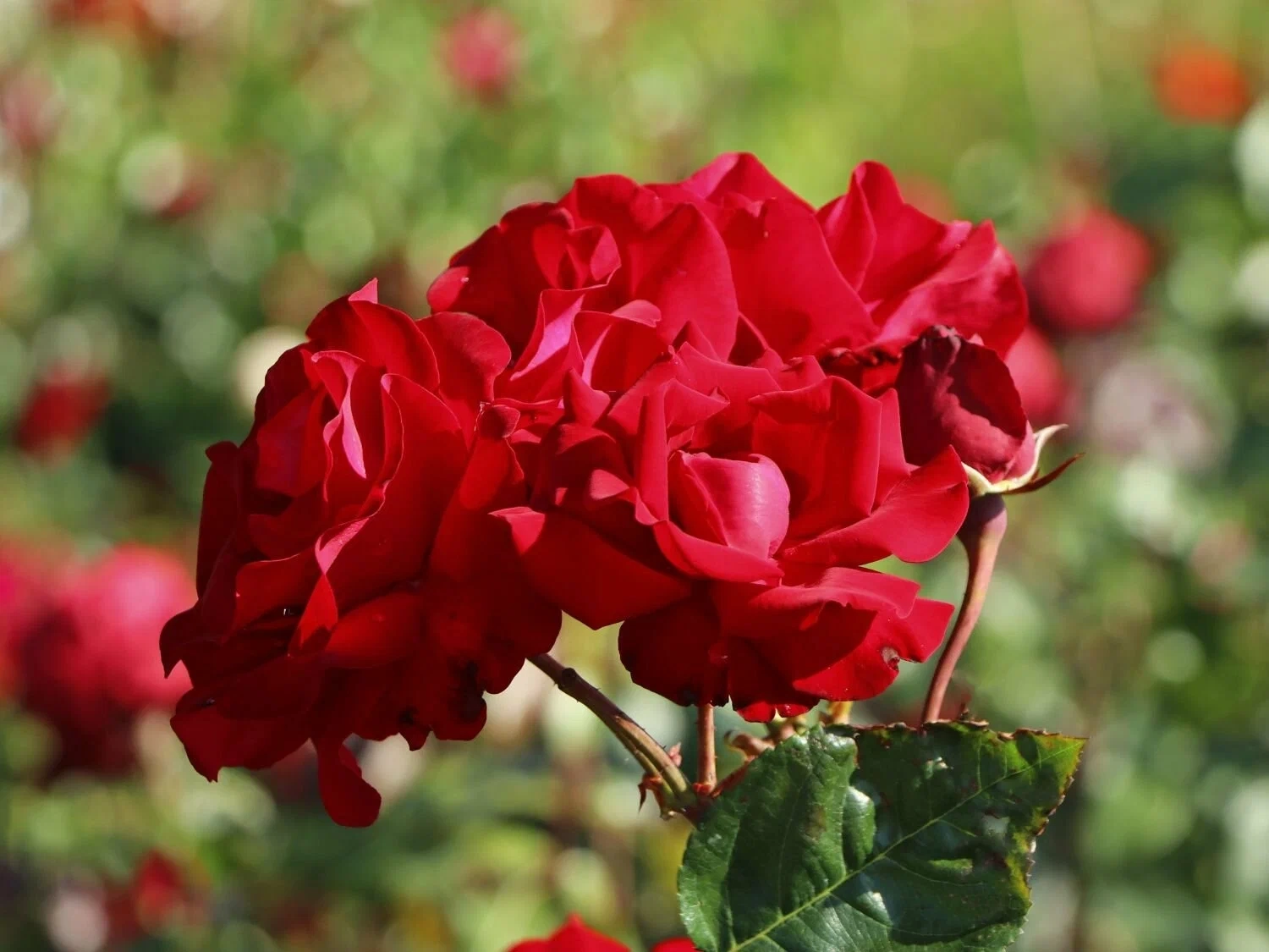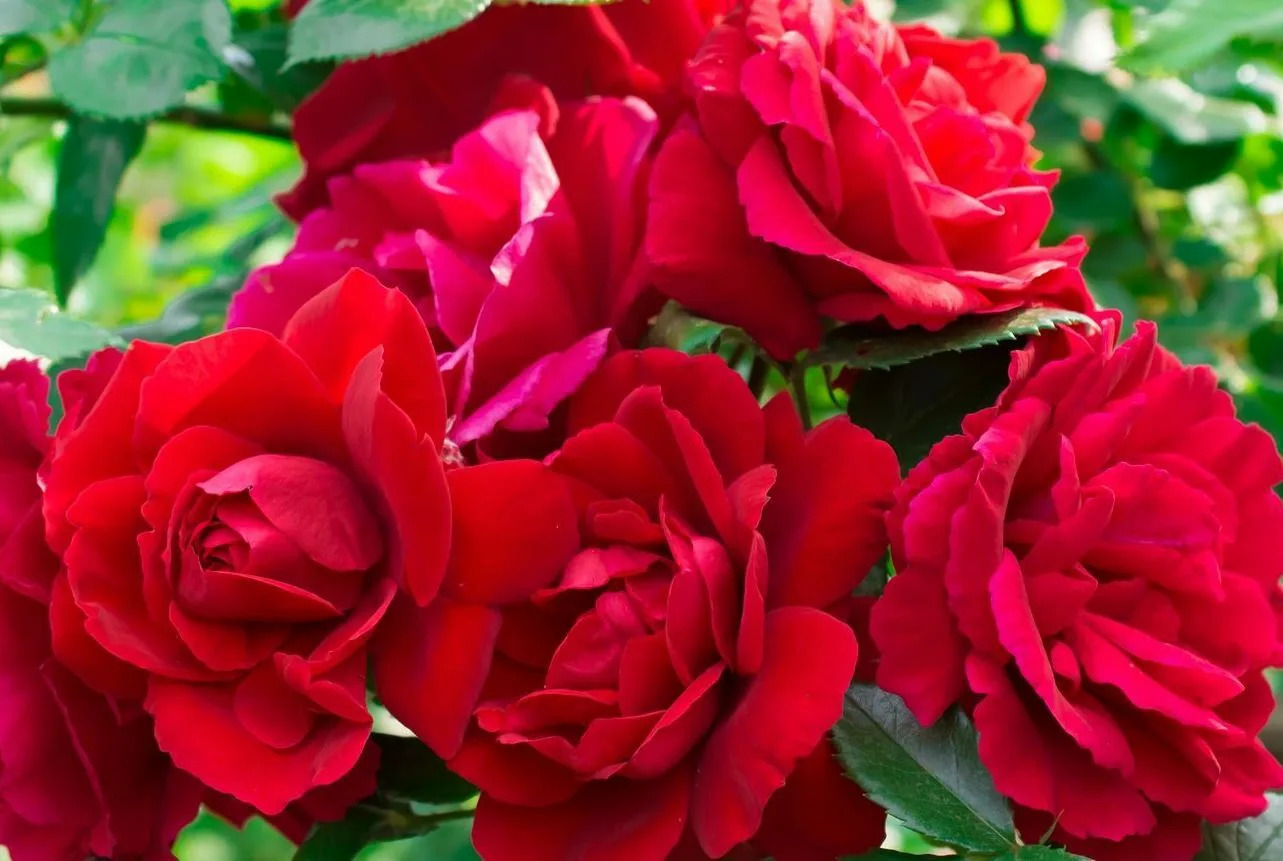 Цветки полумахровые, хороши на всех стадиях роспуска. Они насыщенного, сияющего, кроваво-красного цвета, с бархатным отливом, долго не увядают. Появляются в небольших кистях (как правило, 3-7 цветков), причем не только в верхней части куста, а по всем побегам снизу доверху. Аромат слабый.